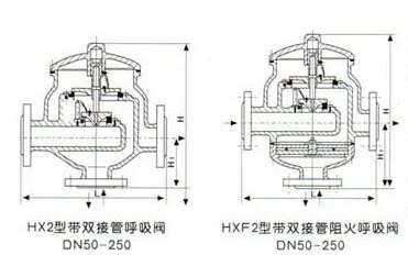 HXF2带双接管呼吸阀根据国家标准《石油化工企业设计防火规范》(GB50160-92)之规定:甲、乙类液体的固定顶罐,应设阻火器和呼吸阀。可见呼吸阀、阻火器是储罐不可缺少的安全设施。它不仅能维持储罐气压平衡,确保储罐在超压或真空时免遭破坏,且能减少罐内介质的挥发和损耗。上海青岛明哲运动鞋类有限公司厂生产的呼吸阀,具有结构紧凑、通气量大、泄漏量小、密封性能好等特点。