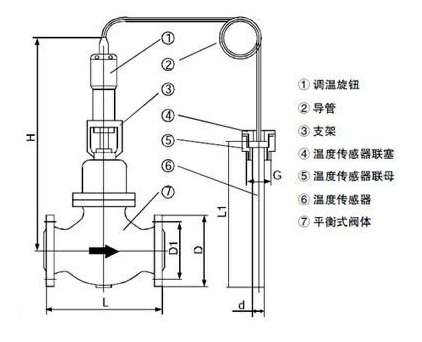 自力式温度调节阀按作用形式可分;加热用温控型,冷却用温控型,合流(分流)温度调节型.是利用感温液体受热膨胀,遇冷收缩及液体不可压缩的原理进行调节.将温度传感器插入需要控制温度的介质中,当介质温度升高时,感受温液体膨胀,作用力克服了弹簧阻力,推动阀芯向下位移,阀门趋于关闭状态,从而减少热媒介质的流量;反之当介质温度低于设定温度时,感温液体收缩,复位弹簧推动阀芯开启状态,增加热媒介质流量,使被控介质温度趋于升高.循环往复,从而使被控介质的温度值始终保持在设定温度允许的范围内.